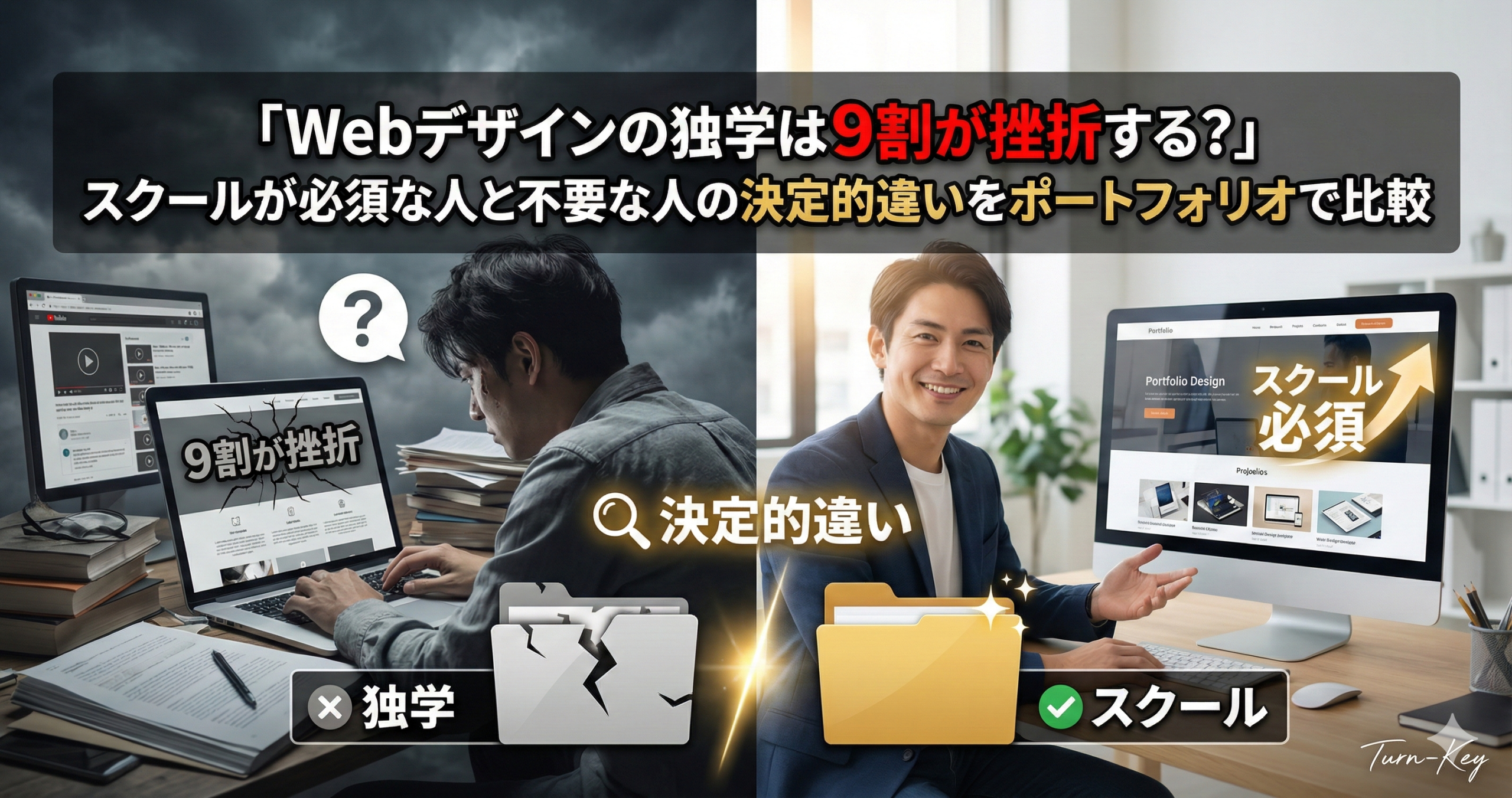 この記事では、まず独学とスクールのメリット・デメリットを客観的に比較し、あなたがどちらに向いているのかを診断します。そして、両者の到達点にどれだけの差が生まれるのかを、リアルなポートフォリオ比較で明らかにしていきます。